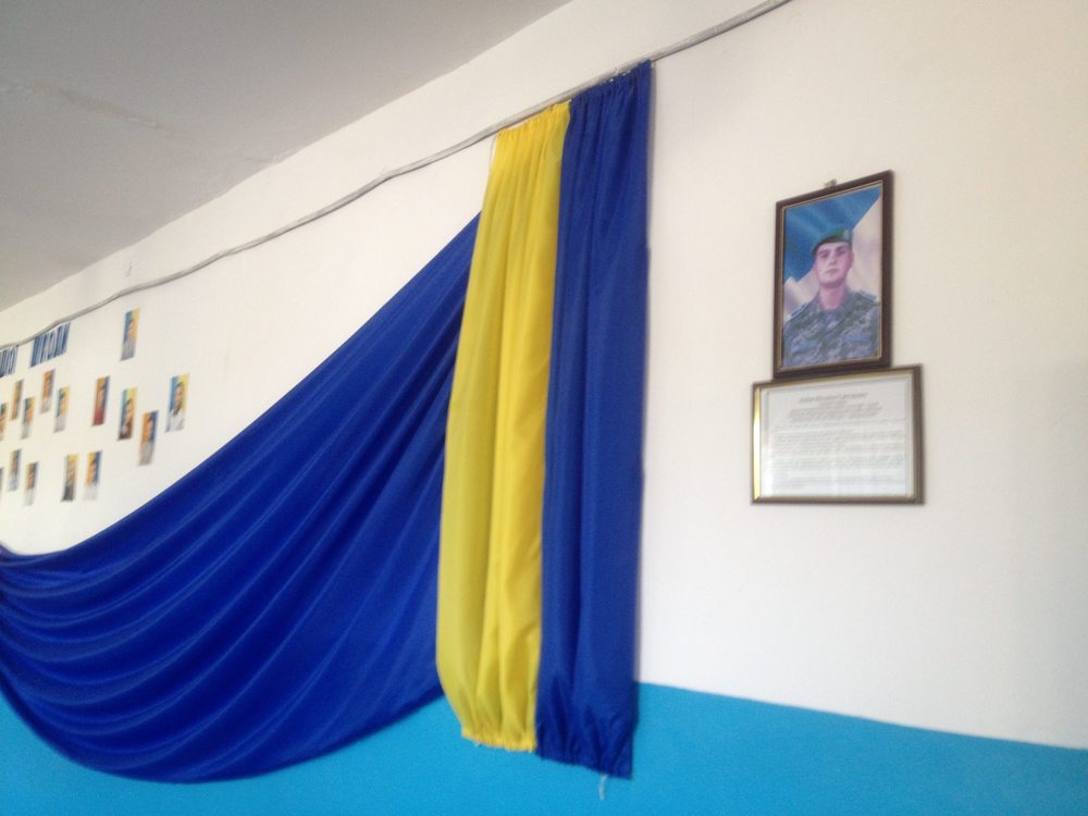 Стены вестибюля школы увешаны патриотической символикой, которая обрамляет портрет павшего в АТО выпускника. Фото: Страна.ua