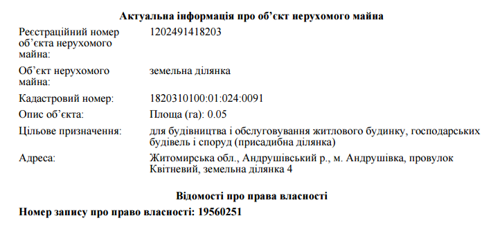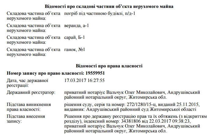 Дом и участок 5 соток перешли в собственность Александра Чуба на основании решения Андрушевского райсуда, которое принял вышеупомянутый судья Виктор Брагин. Это указано в реестре недвижимости, выписку из которого получила "Страна":