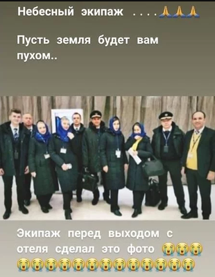 Речь идет об этой совместной фотографии экипажа самолета МАУ. Фото было сделано на выходе из отеля в Тегеране, где они отдыхали перед своим последним полетом. Снимок обнародовала коллега погибших членов экипажа, бортпроводница Юлия