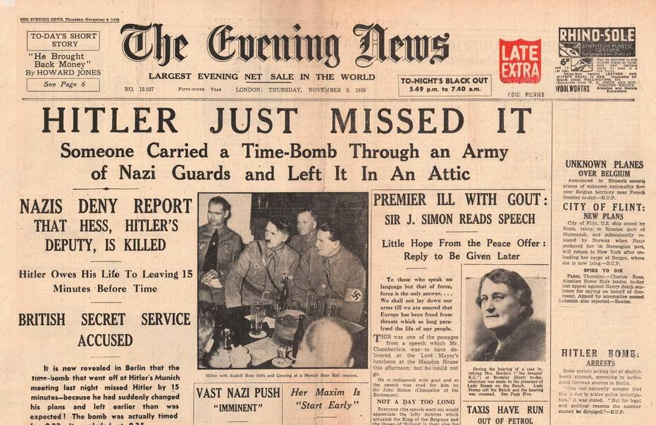 Первая полоса британской The Evening News за 9 ноября 1939: много о Гитлере, ни слова о Финляндии
