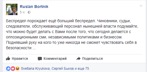 Так высказался о ситуации со "Страной" директор Украинского института анализа и менеджмента политики Руслан Бортник: "Беспредел порождает ещё больший беспредел. Чиновники, судьи, следователи, обслуживающий персонал нынешней власти подумайте, что можно будет делать с Вами после того, что сегодня делается с оппозиционными сми, независимыми политиками и бизнесом. Поднявший руку на кого-то уже никогда не сможет чувствовать себя в безопасности ..."