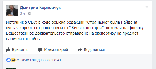 "Источник в СБУ: в ходе обыска редакции "Страна.юа" была найдена пустая коробка от рошеновского " Киевского торта", похожая на флешку. Вещественное доказательство отправлено на экспертизу на предмет наличия гостайны".