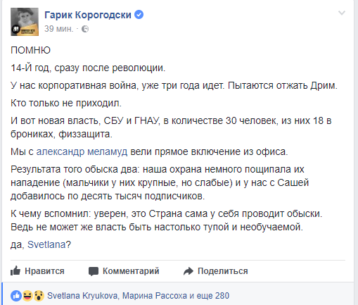 "Настільки системна "увага" правоохоронців до одного ЗМІ - а перші заяви про утиски редакція робила у січні, а у лютому Представник ОБСЄ з питань свободи медіа Дуня Міятович щодо цієї ситуації зверталася до українського уряду - свідчить про вибірковий підхід влади. Бо ще виникала справа із нібито вимаганням головним редактором коштів з народного депутата - і ми всі були свідками недопуску адвокатів та нічного обшуку редакції та затримання Ігоря Гужви. Після того пішла справа про певну таємничу "флешку" із секретами Міноборони.