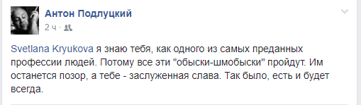 Медиаменеджер Антон Подлуцкий поддержал заместителя главного редактора "Страны" Светлану Крюкову: "я знаю тебя, как одного из самых преданных профессии людей. Потому все эти "обыски-шмобыски" пройдут. Им останется позор, а тебе - заслуженная слава. Так было, есть и будет всегда".