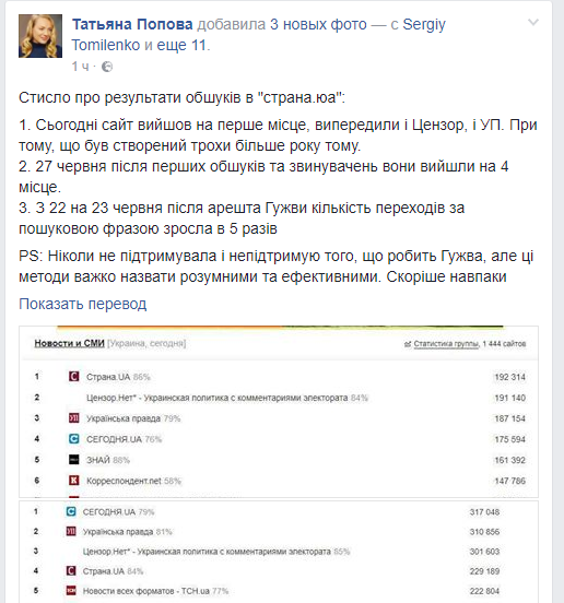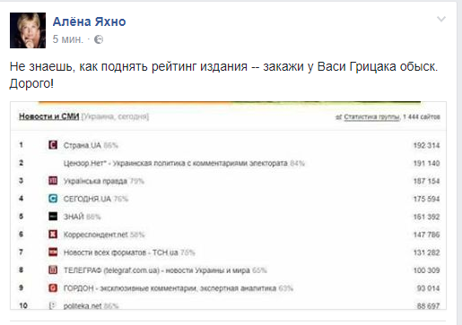 Алена Яхно также подметила: "Не знаешь, как поднять рейтинг издания -- закажи у Васи Грицака обыск. Дорого!" – и опубликовала скриншот рейтинга СМИ, где "Страна" – первая в ТОПе.