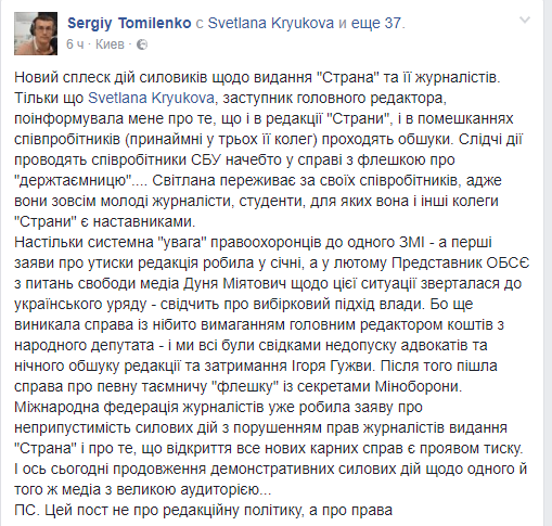 Міжнародна федерація журналістів уже робила заяву про неприпустимість силових дій з порушенням прав журналістів видання "Страна" і про те, що відкриття все нових карних справ є проявом тиску. І ось сьогодні продовження демонстративних силових дій щодо одного й того ж медіа з великою аудиторією...".