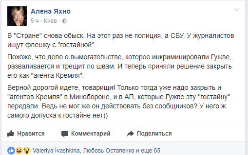 Алена Яхно иронично написала: "В "Стране" снова обыск. На этот раз не полиция, а СБУ. У журналистов ищут флешку с "гостайной".