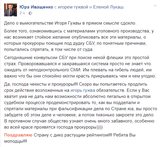 "Да, господа чекисты и прокуроры!!! Скоро вы попытаетесь продлить срок действия возложенных на Игорь Гужва обязательств. Если у Вас хватит ума не дать нам возможности абсолютно легально в открытом судебном процессе продемонстрировать то, как вы подделали и спрятали материалы при фальсификации дела по Стране.юа, вы просто забудете об этом деле и человеке, а потом тихонько закроете это дело. В противном случае общество узнает очень много забавного, особенно во всей красе проявятся господа прокуроры", - резюмирует адвокат.