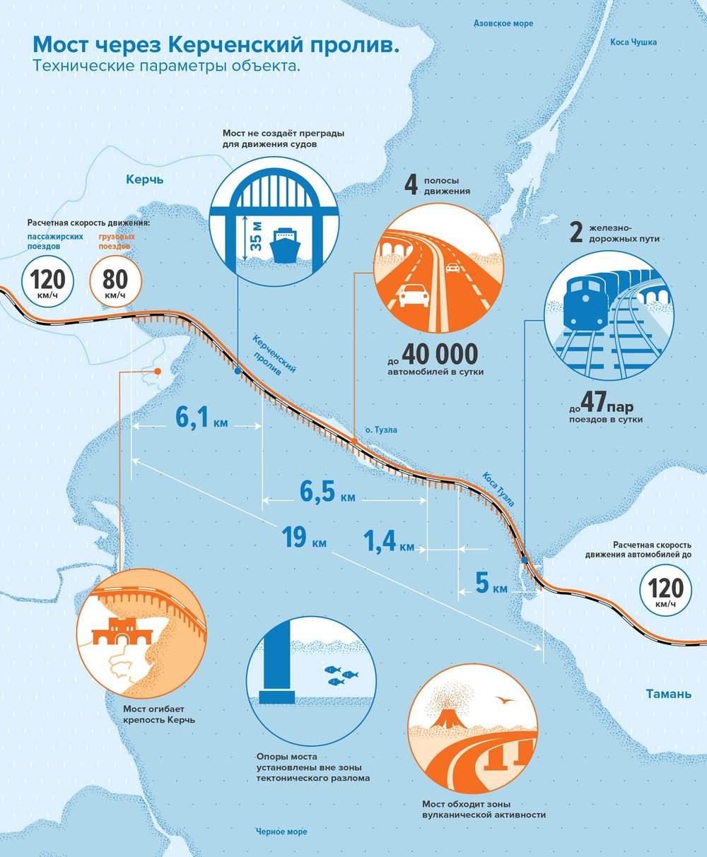Карта Керченского моста и его главные параметры в рекламной инфографике строителей моста. Источник: most.life