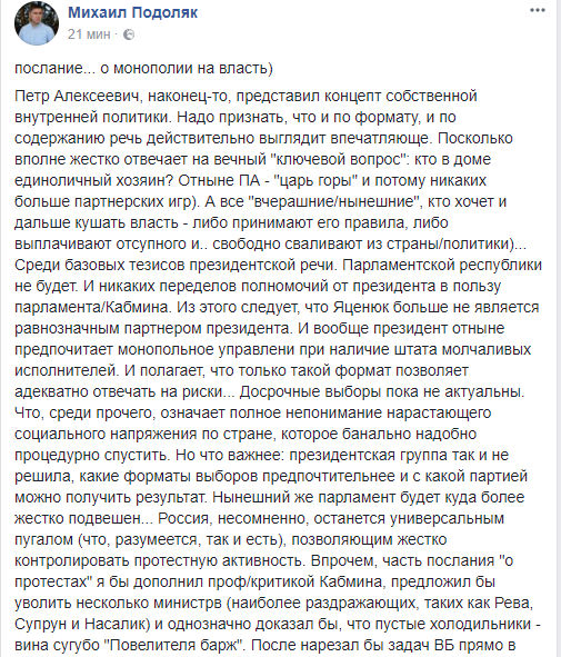 "Петр Алексеевич, наконец-то, представил концепт собственной внутренней политики. Надо признать, что и по формату, и по содержанию речь действительно выглядит впечатляюще. Посколько вполне жестко отвечает на вечный "ключевой вопрос": кто в доме единоличный хозяин? Отныне ПА - "царь горы" и потому никаких больше партнерских игр). А все "вчерашние/нынешние", кто хочет и дальше кушать власть - либо принимают его правила, либо выплачивают отсупного и.. свободно сваливают из страны/политики)", – отмечает Подоляк.