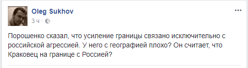 Журналист Олег Сухов в преддверии эпического возвращения экс-губернатора Одесской области Михаила Саакашвили в Украину через пункт пропуска Краковец на границе с Польшей акцентировал внимание на другом. "Порошенко сказал, что усиление границы связано исключительно с российской агрессией. У него с географией плохо? Он считает, что Краковец на границе с Россией?".