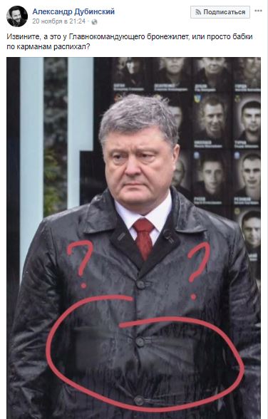 Телеведущий Александр Дубинский у себя на странице в соцсети Facebook под фото с президентом в мокром плаще написал: "Извините, а это у Главнокомандующего бронежилет, или просто бабки по карманам распихал?" - на что посыпались сотни комментариев с предположениями, что у Порошенко в карманах верхней одежды.