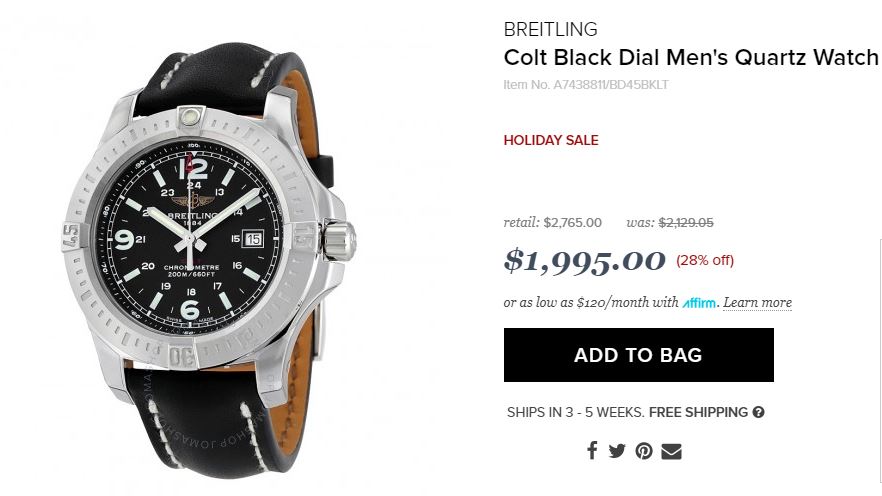 Модель Colt Quartz со стальным корпусом и матовым безелем (ободком). В ней установлен механизм Breitling SuperQuartz, являющийся вершиной электронных технологий, в десять раз более точный, чем стандартный кварцевый. Как указано на официальном сайте производителя, циферблат обеспечивает большую легкость восприятия, благодаря четырем большим часовым меткам и стрелкам, на которые нанесено люминесцентное покрытие.