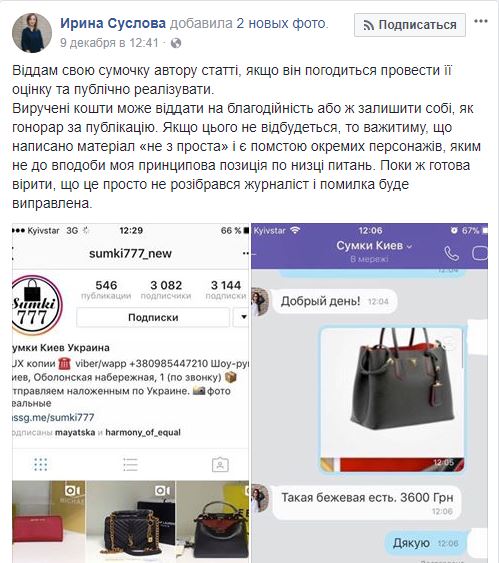 "Отдам свою сумочку автору статьи, если он согласится оценить ее и публично осветить. Вырученные деньги может отдать на благотворительность или оставить себе, в качестве гонорара за публикацию. Если такое не случится, буду считать, что материал опубликован "неспроста" и является местью отдельных персонажей, которым не по душе моя принципиальная позиция по ряду вопросов. Пока ж готова верить, что это просто не разобрался журналист и ошибка будет исправлена", - написала Ирина Суслова.