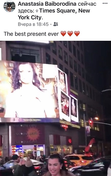 Он разместил фотографии себя и своей девушки на огромном бигборде в центре Нью-Йорка (США). На одном из зданий Таймс-сквер (площадь в центральной части Манхэттена) показали снимки Насти.