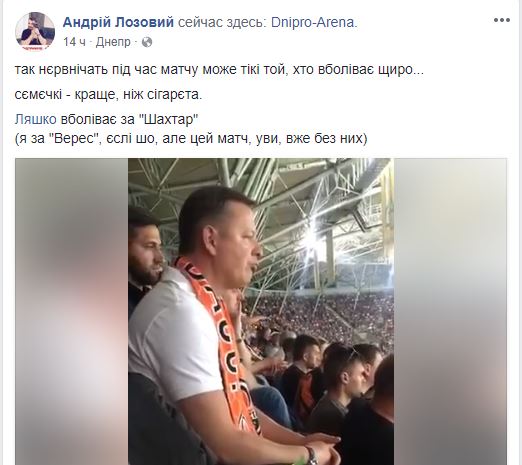 В социальную сеть Facebook выложил этот видеоролик Андрей Лозовой, друг и правая рука Олега Валериевича. Именно Лозовой в своих социальных сетях распространил видео главного радикала с семечками. И сделал текстовку: "Так нервничать во время матча может только тот, кто болеет искренне. Семечки - лучше, чем сигарета. Ляшко более за "Шахтер".
