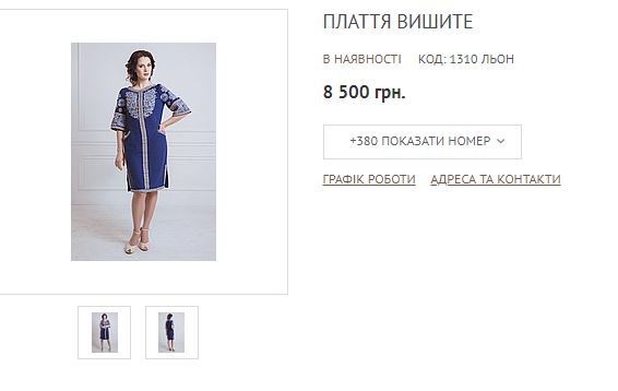 Как указано на сайте, платье – праздничная модель длины миди, выполненная из белоснежного льна и украшенная красно-синей вышивкой гладью. Изготовлено на украинском производстве.