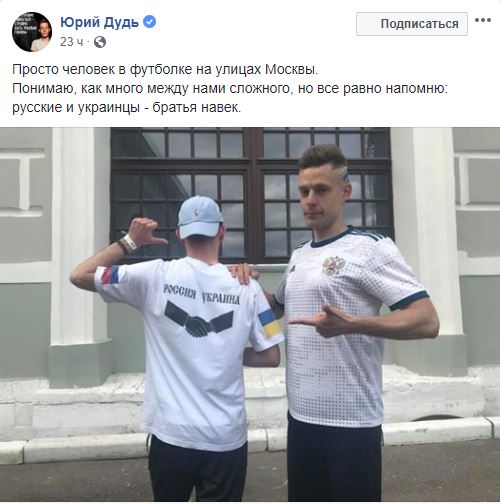 Об этом Юрий написал на своей странице в Facebook, опубликовав сделанное в Москве фото с парнем в футболке, на которой было изображено рукопожатие России и Украины.