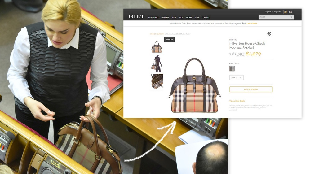 Кстати, Ляшко не единственный депутат, у которого есть вещи Burberry. Однажды в парламенте фотокорреспонденты "Страны" видели нардепа Татьяну Острикову ("Самопомощь") с сумкой этого бренда