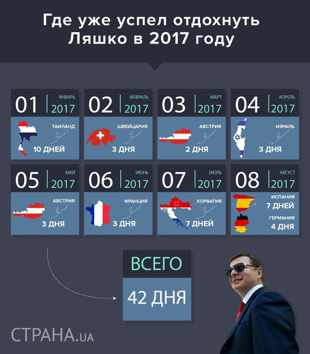 Справедливости ради отметим, что за восемь месяцев 2017 года сам Олег Ляшко провел за границей 42 дня. Он побывал в Таиланде, Швейцарии, Австрии, Израиле, Франции, Хорватии, Испании.