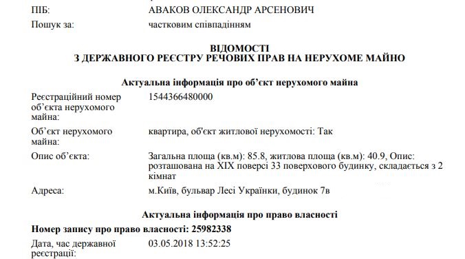 В Государственном реестре прав на недвижимое имущество появилась информация, что Аваков-младший владеет 85.8 квадратными метрами на Печерске. В элитном районе Киева у сына министра появилась 2-комнатная квартира.