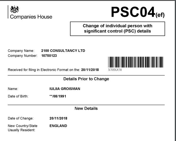 Действительно, ранее сообщали о том, что Юлия Гройсман в мае 2017 года зарегистрировала в Лондоне собственную компанию под названием 2100 consultancy ltd с уставным капиталом в размере 1 фунт стерлингов. Дочь Гройсмана в 25 лет стала директором и единственным владельцем этой фирмы.
