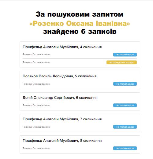Оксана Розенко продолжает работать в Верховной Раде. Она - помощница депутата Анатолия Гиршфельда ("Воля народа") и уже сотрудничает с ним третий созыв. Также Оксана на платной основе работала помощником у нардепов Василия Полякова и Александра Дония.