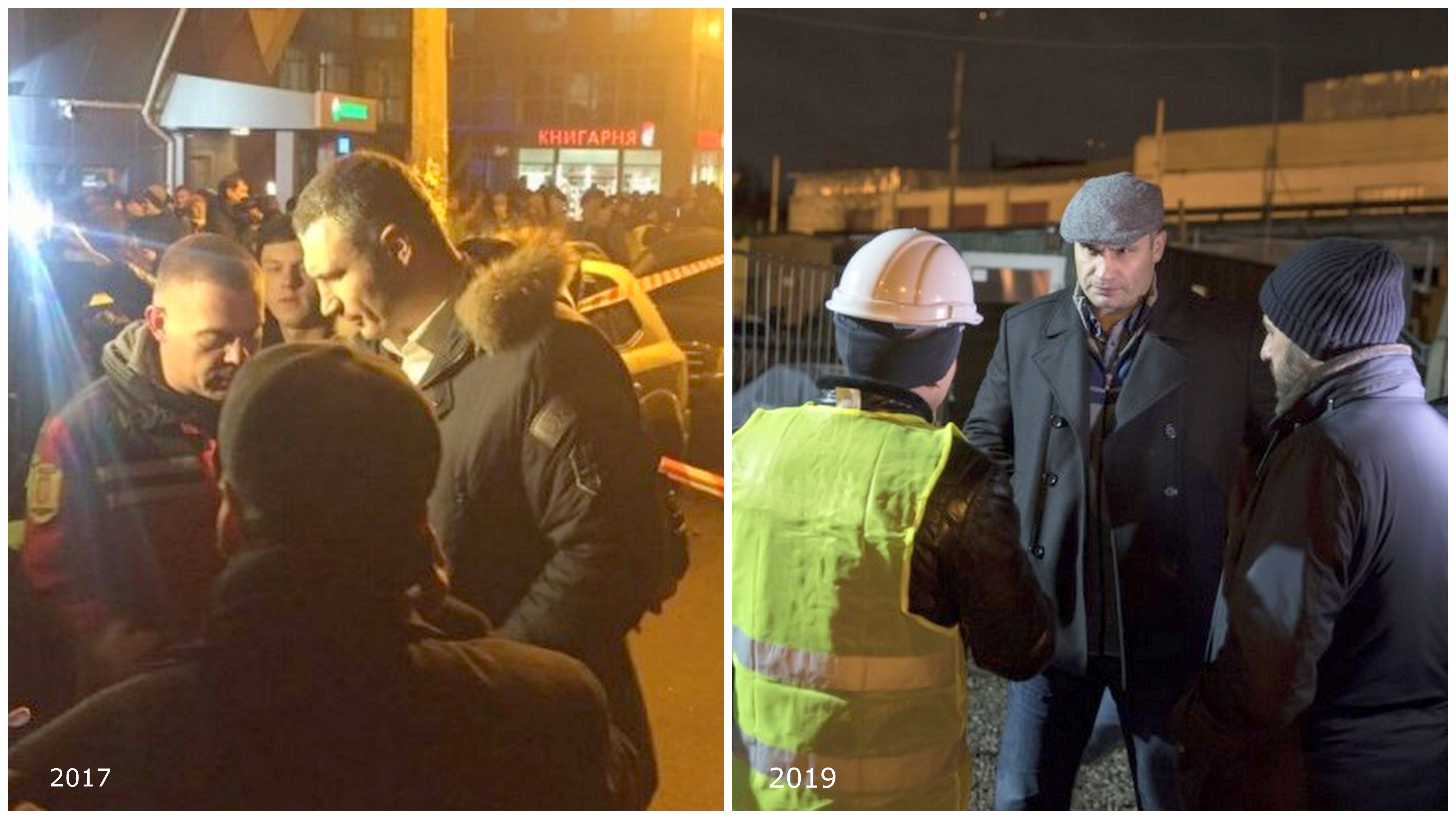 2017 и 2019 год. Кличко на месте обрушившегося Шулявского моста, фото: facebook.com