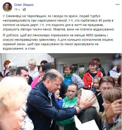 "Я добьюсь, чтобы все пенсионеры получали не менее 4000 гривен и отменю несправедливую уравниловку", - подписал Ляшко фото, на котором он стоит в ветровке Burberry за 18 000 гривен.