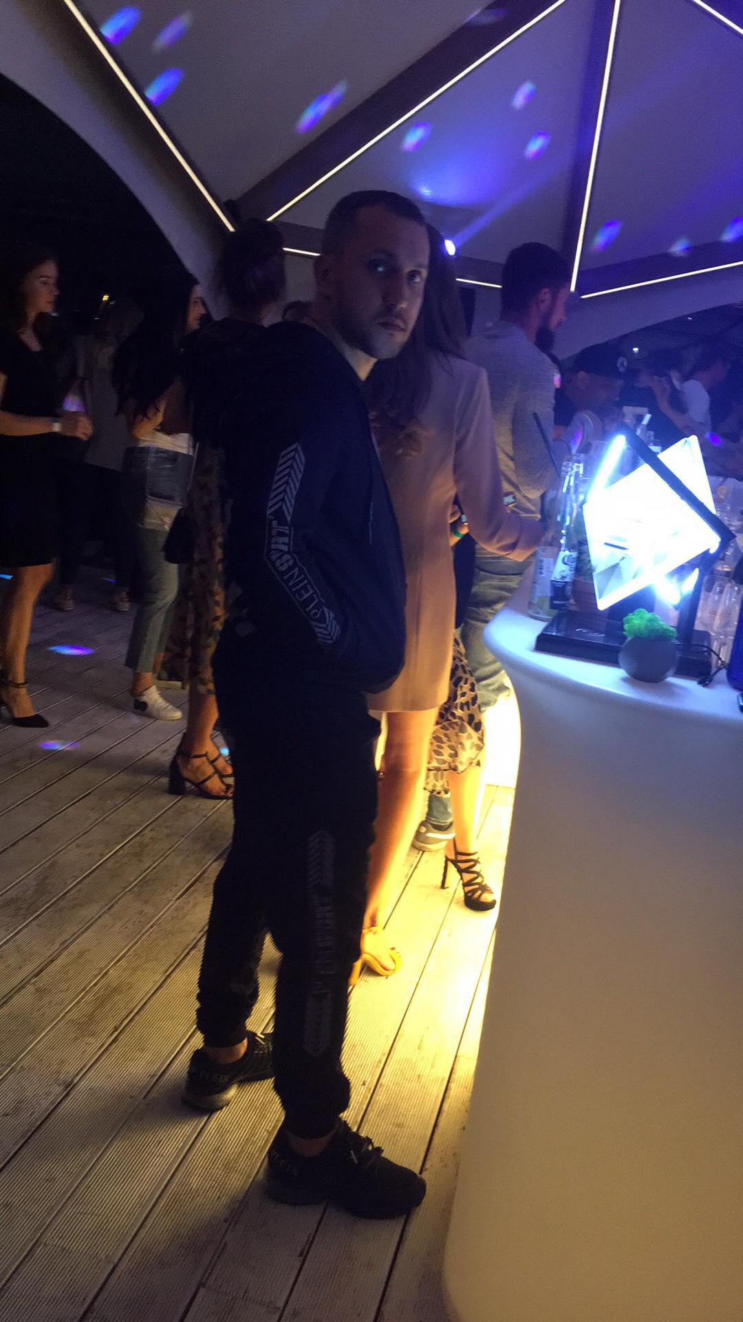 Линько не танцевал и пил коктейль "Мохито" на баре. Одет он был в черный спортивный костюм и в кроссовки фирмы Phillip Plein (они стоят около 10 тысяч гривен).