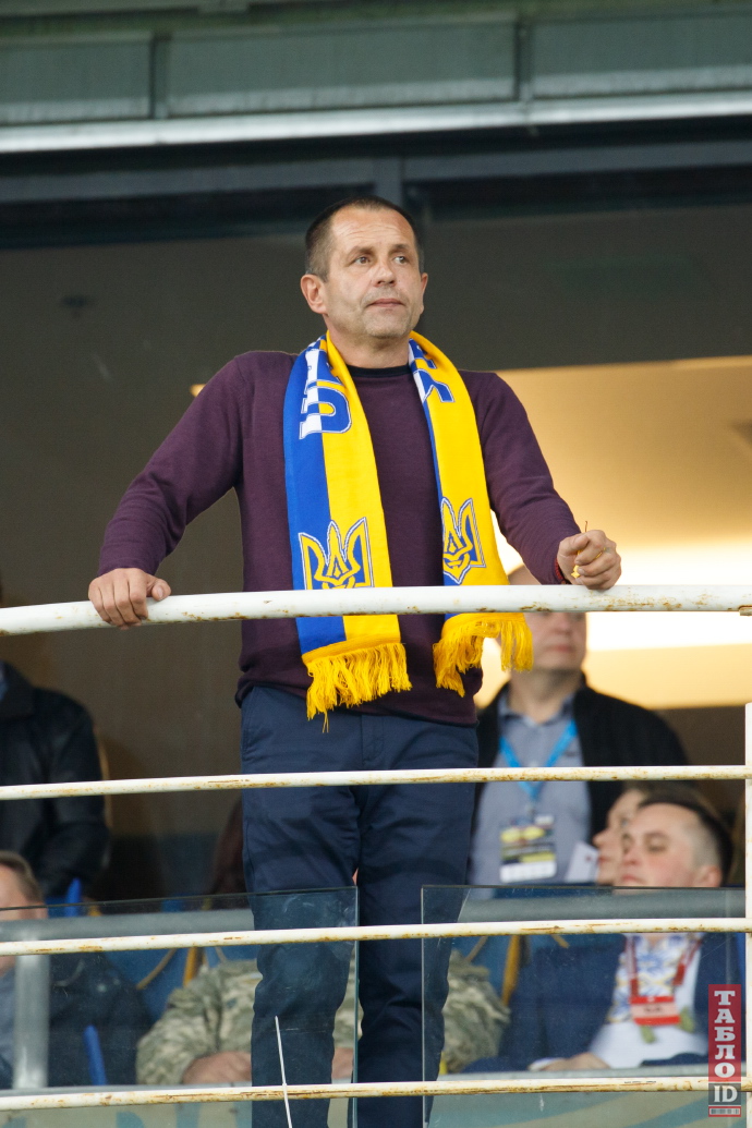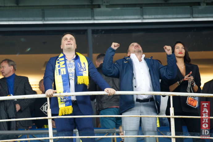 42-летний Андрей Богдан, глава ОП вместе со своим заместителем 38-летним Андреем Смирновым пришли в сектор с флагами Украины. Оба Андрея болели от души: кричали речевки и активно пританцовывали в такт.