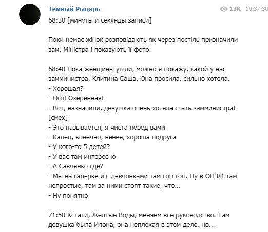 Telegram-канал "Темный рыцарь", который сливает информацию о "слугах", выложил расшифровку части Криворожгейта об Александре.