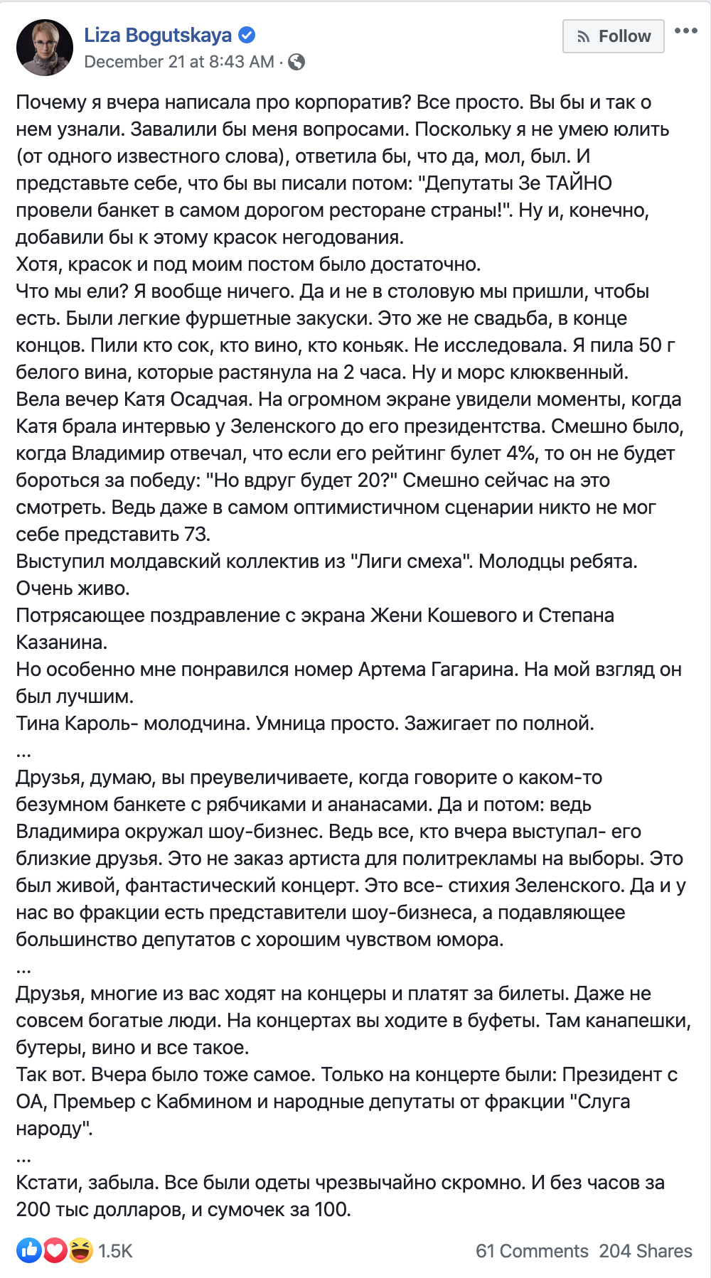 "Что мы ели? Я вообще ничего. Да и не в столовую мы пришли, чтобы есть. Были легкие фуршетные закуски. Это же не свадьба, в конце концов. Пили кто сок, кто вино, кто коньяк. Не исследовала. Я пила 50 г белого вина, которые растянула на 2 часа. Ну и морс клюквенный", - говорится в посте. Также Богуцкая уточнила, что на корпоратив никто не наряжался: "Все были одеты чрезвычайно скромно. И без часов за 200 тыс долларов, и сумочек за 100".