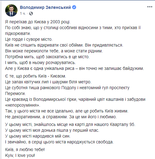 Зе отметил, что у Киева есть несколько черт, которые делают его уникальным, – это запах цветущих лип и шаурмы возле метро, это субботняя тишина утреннего Подола и неутомимый гул проспекта Победы. Также Киев имеет особенный вид с Владимирской горки, волшебный цвет каштанов и свои застройки-"недоразумения".