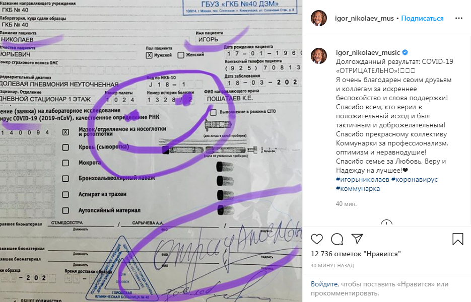 "Долгожданный результат: Covid-19 - "Отрицательно"! Я очень благодарен своим друзьям и коллегам за искреннее беспокойство и слова поддержки! Спасибо всем, кто верил в положительный исход и был тактичным и доброжелательным! Спасибо прекрасному коллективу Коммунарки за профессионализм, оптимизм и неравнодушие!.." - написал музыкант.