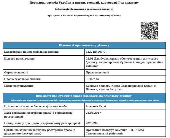 По данным с Государственного геокадастра, в 2017 году Гули Аласания, мать политика приобрела в Лесниках участок земли чуть больше 10 соток.