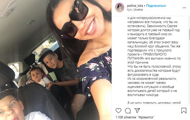 "Зависимость Сергея, которая длится уже не первый год, и выходить в трезвый мир он может только благодаря капельницам, об этом знает весь наш близкий круг общения. Также подтвердили, что с прошлого проекта "Правильного питания" его выгнали именно по этой причине. Чтобы не быть голословной, этому есть доказательства, которые будут фигурировать в суде. Из-за искривленной реальности человек не может трезво оценивать ситуацию и вообще воспитывать детей, которых и не воспитывал никогда. Я не могу доверить человеку детей, который на завтрак их кормит семечками, от этого просто у меня разрывается сердце", - пишет Полина.