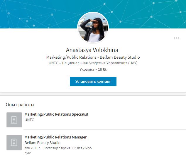 Она получила диплом бакалавра по правоведению и диплом магистра по маркетингу. Мы нашли резюме девушки в социальной сети LinkedIn. Судя по ее профилю в соцсети для деловых контактов, она уже шесть лет работает в салоне красоты "БелФам" специалистом по маркетингу и паблик рилейшнз (англ. Public Relations - связи с общественностью).