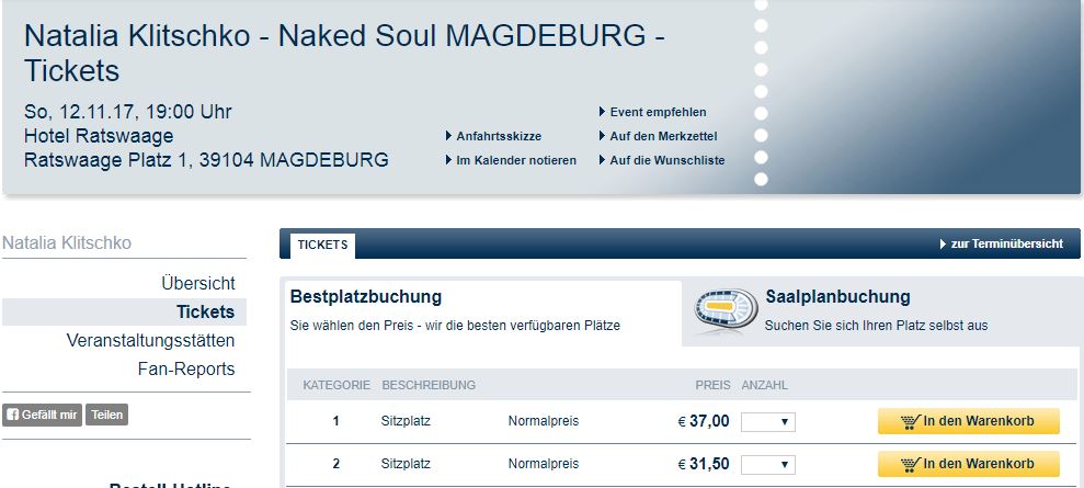 Цены на билеты разные. К примеру в Зильте можно сходить за €25 (778 грн по курсу НБУ на 26.09.2017), а вот Магдебурге Наталья Кличко будет выступать в зале гостиницы Hotel Ratswaage, где билеты по €31,5 и €37 (1151 грн).