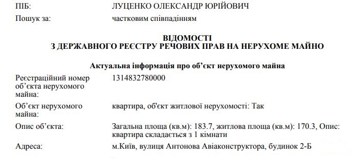 Согласно выписке из Государственного реестра прав на недвижимое имущество, 1 августа 2017 года Александр Луценко стал собственником квартиры общей площадью 183, 7 кв.м. (жилая из них - 170,3 кв.м). В документе уточняется, что это однокомнатные апартаменты. По указанному адресу находится новый элитный 24-этажный ЖК "Шервуд" (Sherwood) с видом на лес.