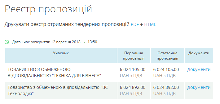 В тендере участвовали лишь два претендента. Их начальные цены отличались всего на 792 грн. А во время аукциона участники даже не изображали торги: первоначальные цены так и остались без изменений.