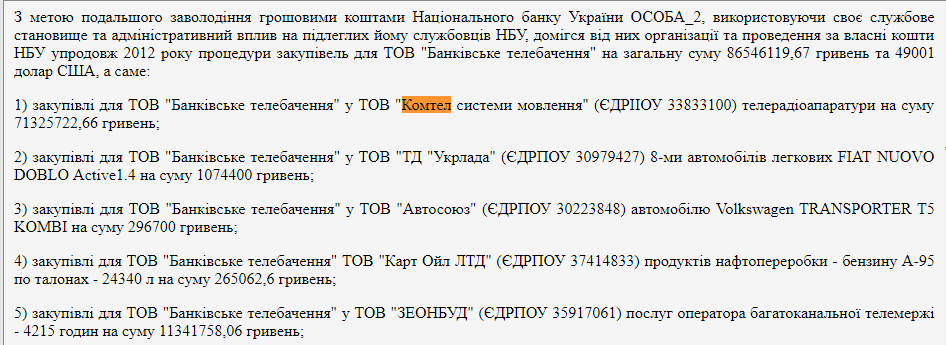 ООО "Комтел системы вещания" фигурирует в громком уголовном производстве № 42014000000000359, которое уже пять лет ведет Генеральная прокуратура. По нему бывшего главу Нацбанка времен Януковича Сергея Арбузова обвиняют в присвоении имущества в особо крупных размерах.