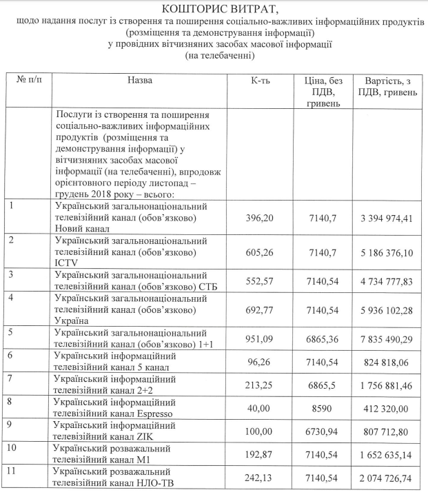 Больше всех Минстець заплатил за рекламу на канале "1+1", который принадлежит олигарху Игорю Коломойскому, – 7,8 млн грн. На втором месте канал "Украина" (5,9 млн), который принадлежит Ринату Ахметову.