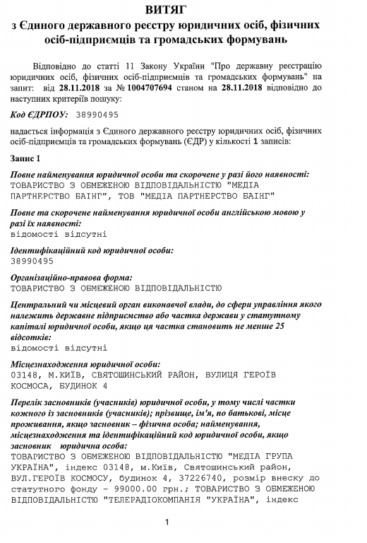 Крупнейшим получателем средств от ЦЗИПУ в 2018 году стало рекламное агентство "Медиа партнерство Баинг". Компания получила 19,4 млн грн за размещение телерекламы. В тендере участвовало еще одно ООО "Стар ап".