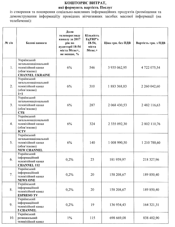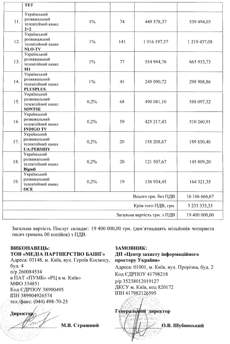 Согласно условиям опубликованного договора, из полученных 19,4 миллиона рекламисты потратили 4,7 млн грн на свой "родной" телеканал "Украина". Это наибольшая часть из полученных денег, другие телеканалы получили в разы меньше: