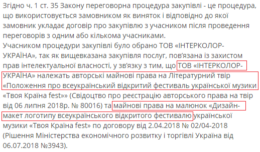 В обоих случаях договоры были заключены без тендера. Формальной причиной стало то, что ООО "Интерколор-Украина" владеет авторскими правами на положение о фестивале, а также на его логотип: