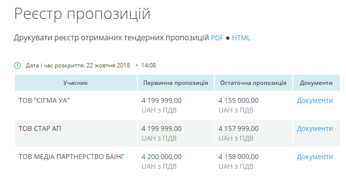 В тендере на 4,2 млн все три фирмы выставили начальные цены, которые отличались на 1 грн. Окончательные ценовые предложения фирм, которые "проиграли" тендер, также отличались всего на 1 грн. Цена победителя "Сигма УА" отличалась от цен конкурентов всего на 3 тыс. грн, снизившись во время "торгов" на 45 тыс. грн: