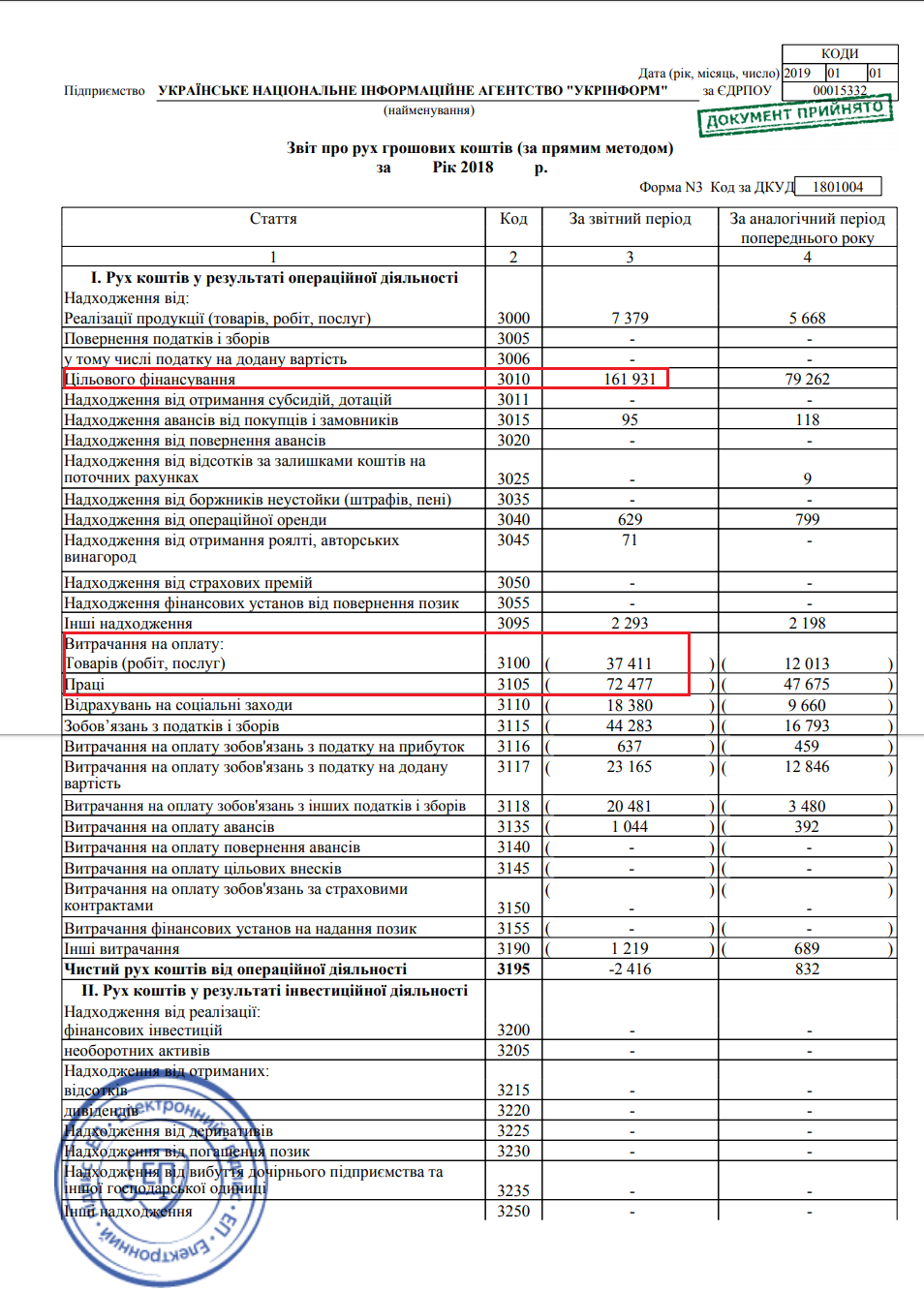 Согласно опубликованному на сайте агентства Отчету о движении денежных средств, в 2018 году оно получило "всего" 162 млн грн целевого финансирования. Из них почти половина (72,5 млн грн) была потрачена на выплату зарплат. Еще 37,4 млн в агентстве потратили на оплату товаров и услуг: