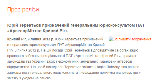 Согласно пресс-релизу, размещенному на сайте "АрселорМиттал Кривой Рог", Юрий Терентьев был назначен генеральным юрисконсультом криворожского гиганта летом 2012 года: