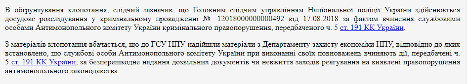 Изъятие документов разрешено в рамках уголовного производства по факту совершения уголовного преступления должностными лицами АМКУ. По версии полиции, они совершали действия, предусмотренные в части 5 статьи 191 Уголовного кодекса Украины – присвоение или завладение имуществом путем злоупотребления служебным положением, в особо крупных размерах или организованной группой.